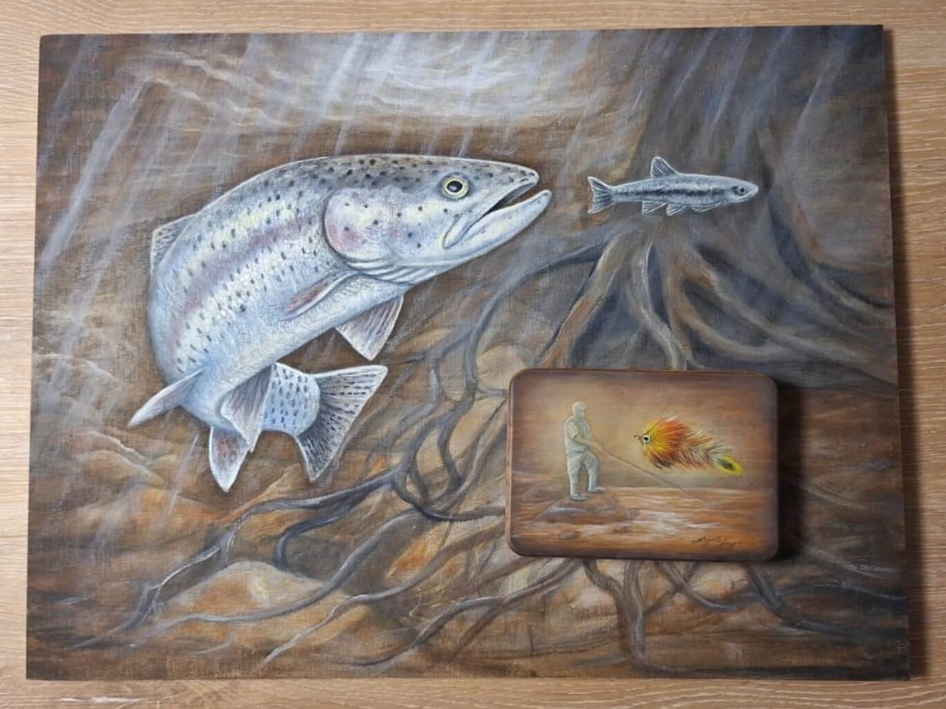 Die Fischerei ist für mich mehr als Technik – sie ist Rhythmus, Natur und Hingabe. In meinen Gemälden erzähle ich Geschichten von der stillen Kraft der Fische, der Eleganz ihrer Bewegung und der Atmosphäre am Wasser. Jeder Pinselstrich spiegelt die Dynamik des Wassers wider und erweckt die Unterwasserlandschaften zum Leben. Ob Äsche, Forelle oder Hecht – jedes Motiv entsteht aus Beobachtung, Respekt und Liebe zum Detail. Meine Werke verbinden klassische Ölmalerei mit modernen Bildträgern wie Leinwand, Holz oder Antik-Papyrus. Sie sind Fenster in eine andere Welt – Ausdruck einer tiefen Verbindung zur Natur und zur Kunst des Fliegenfischens.